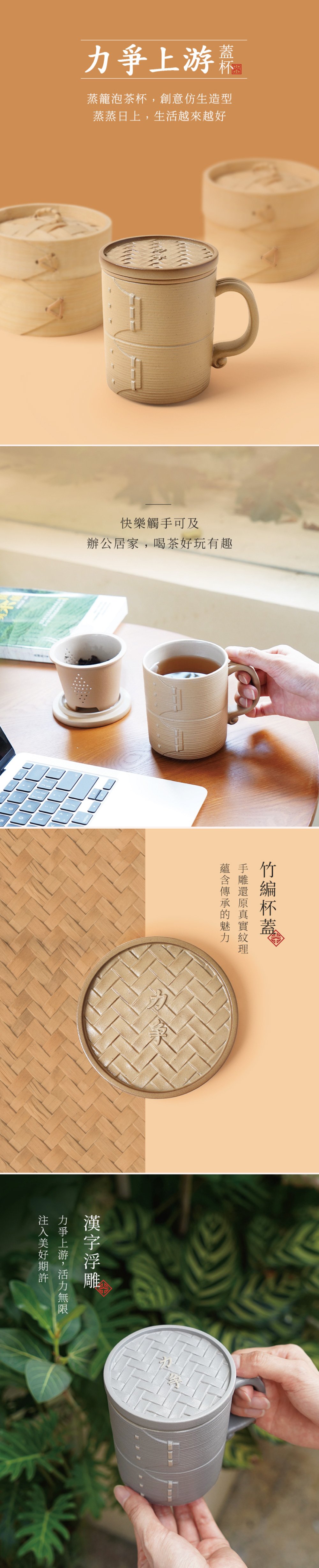 竹編杯蓋,漢字「力爭」浮雕,