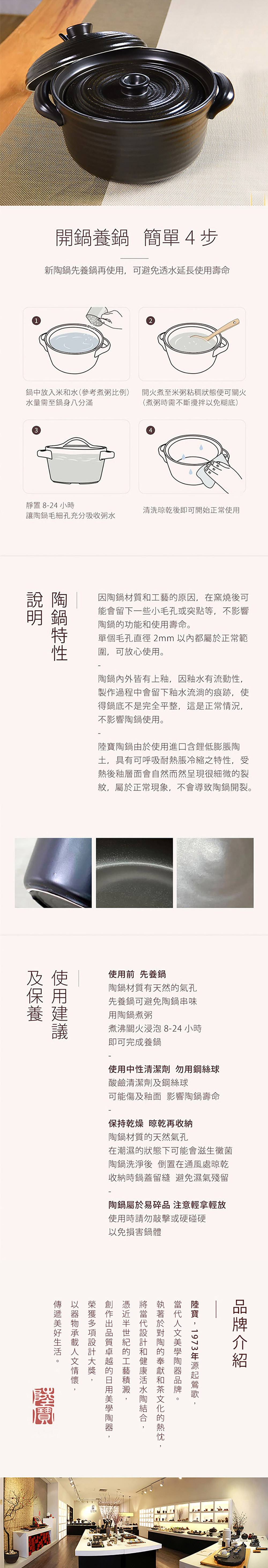 1.第一次使用陶鍋時前,需要先煮白粥養鍋,鎖住毛細孔,避免滲水或串味。養鍋還能讓陶鍋更耐燒並可延長陶鍋的使用壽命。