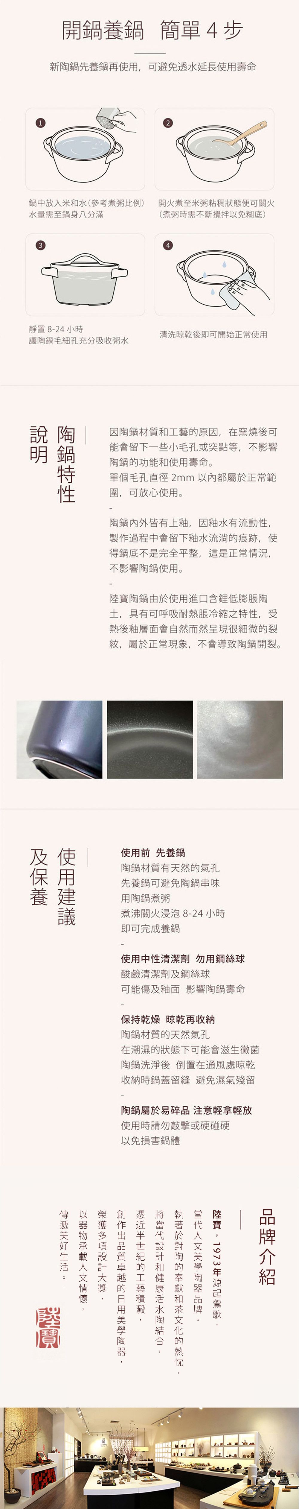 1.第一次使用陶鍋時前,需要先煮白粥養鍋,鎖住毛細孔,避免滲水或串味。養鍋還能讓陶鍋更耐燒並可延長陶鍋的使用壽命。
