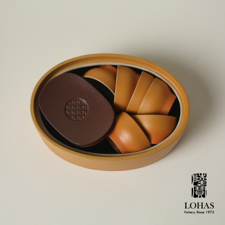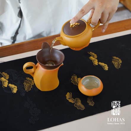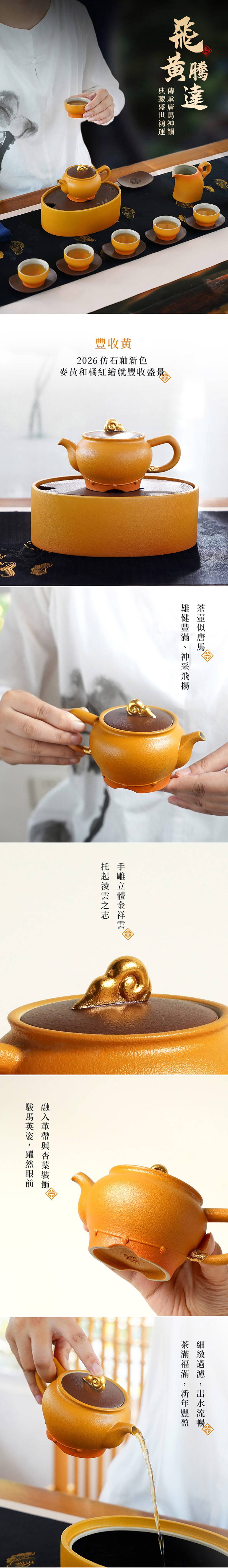 麥黃漸變釉色繪就豐收美景,輔以銅錢紋杯托與馬踏祥雲兩用茶寵,寓意生活富足、駕馭好運。