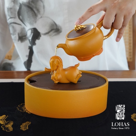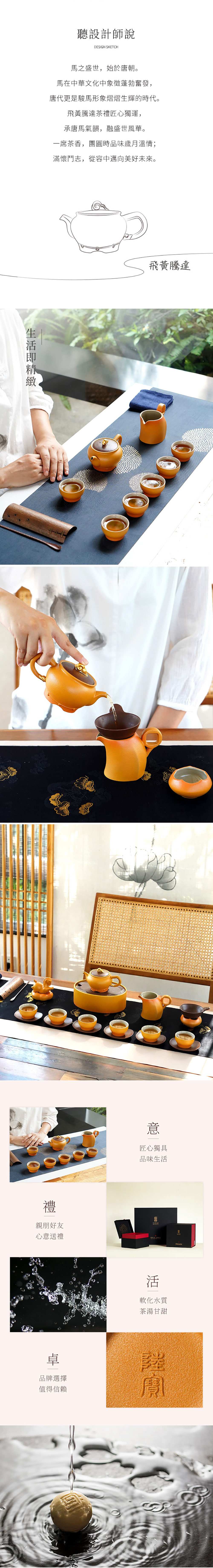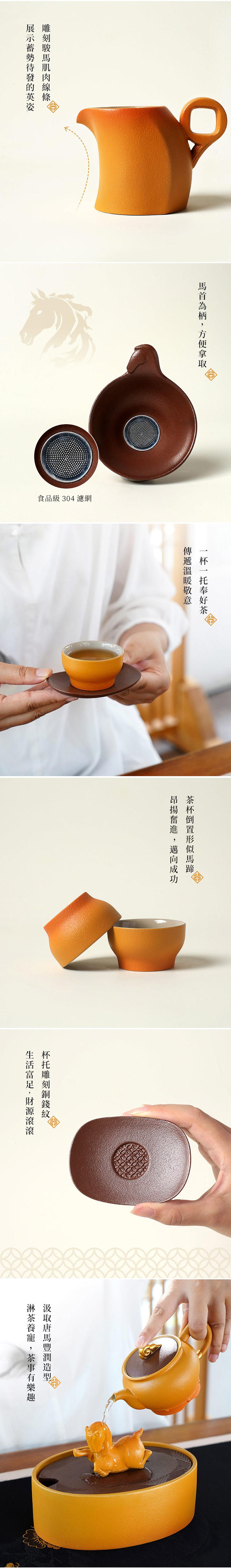 茶海細膩雕琢駿馬肌肉線條,搭配倒置如馬蹄的茶杯與馬首柄茶濾,象徵蓄勢待發、前程似錦。